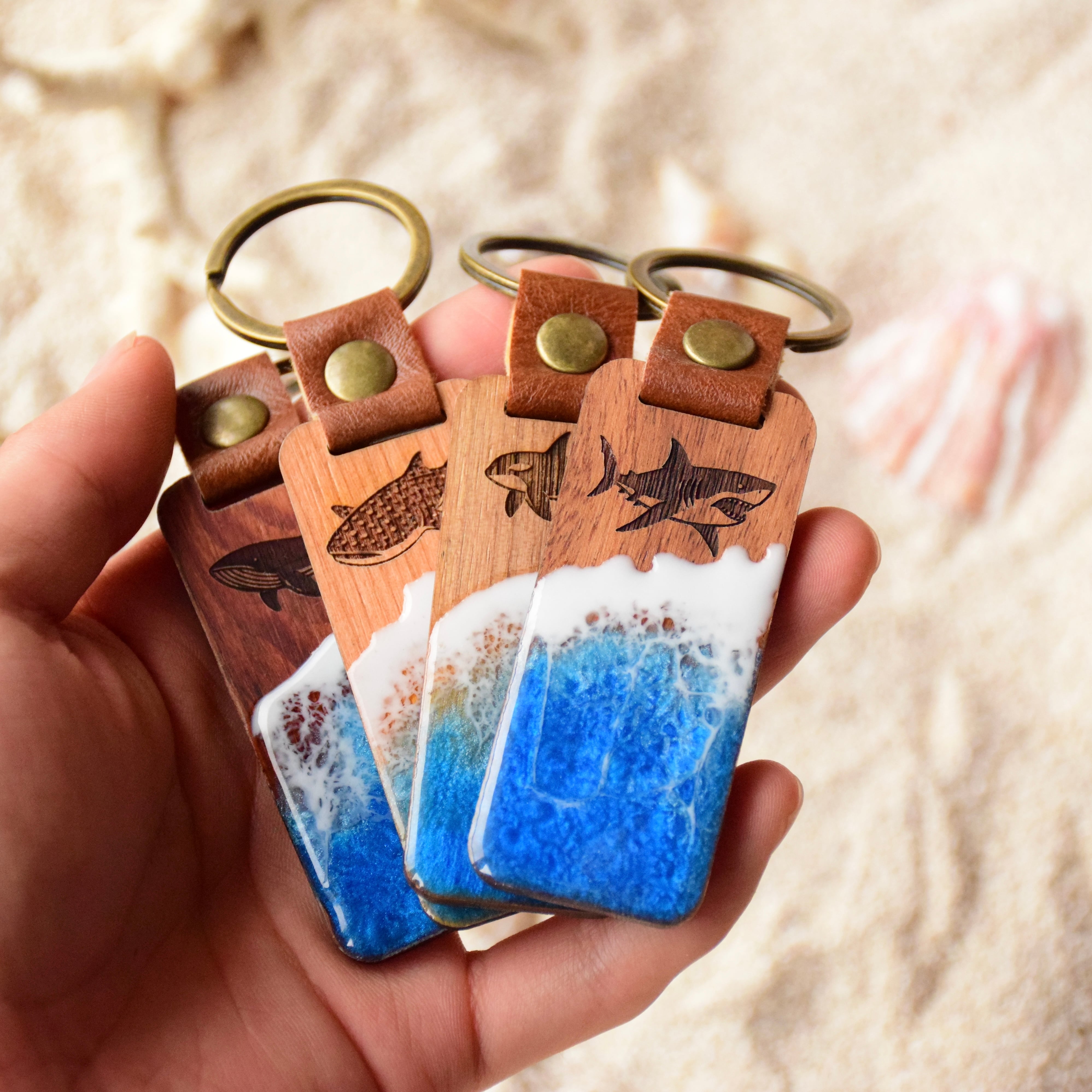 海アート×天然木 キーホルダー うみのいきもの レザーキーホルダー